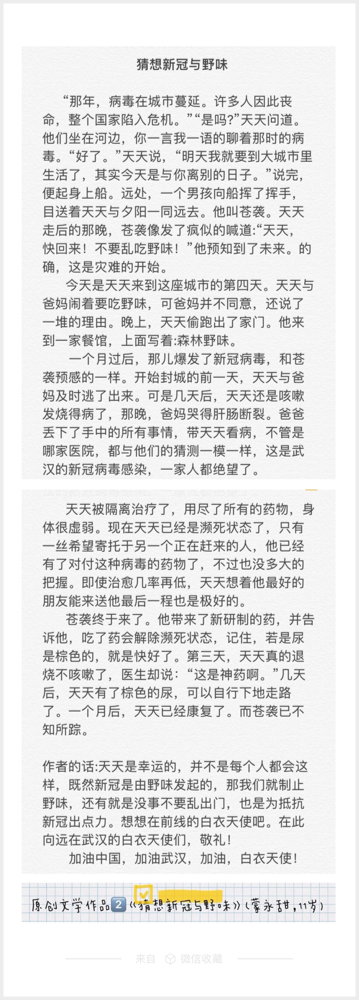 疫情面前,没有旁观者。柳州计量人的孩子们用稚嫩的画笔、朴素的文字、纯净的声音,用心记录了这个特殊的时期。他们怀着对大自然的敬畏,对英雄们的感恩、对春暖花开的期待......